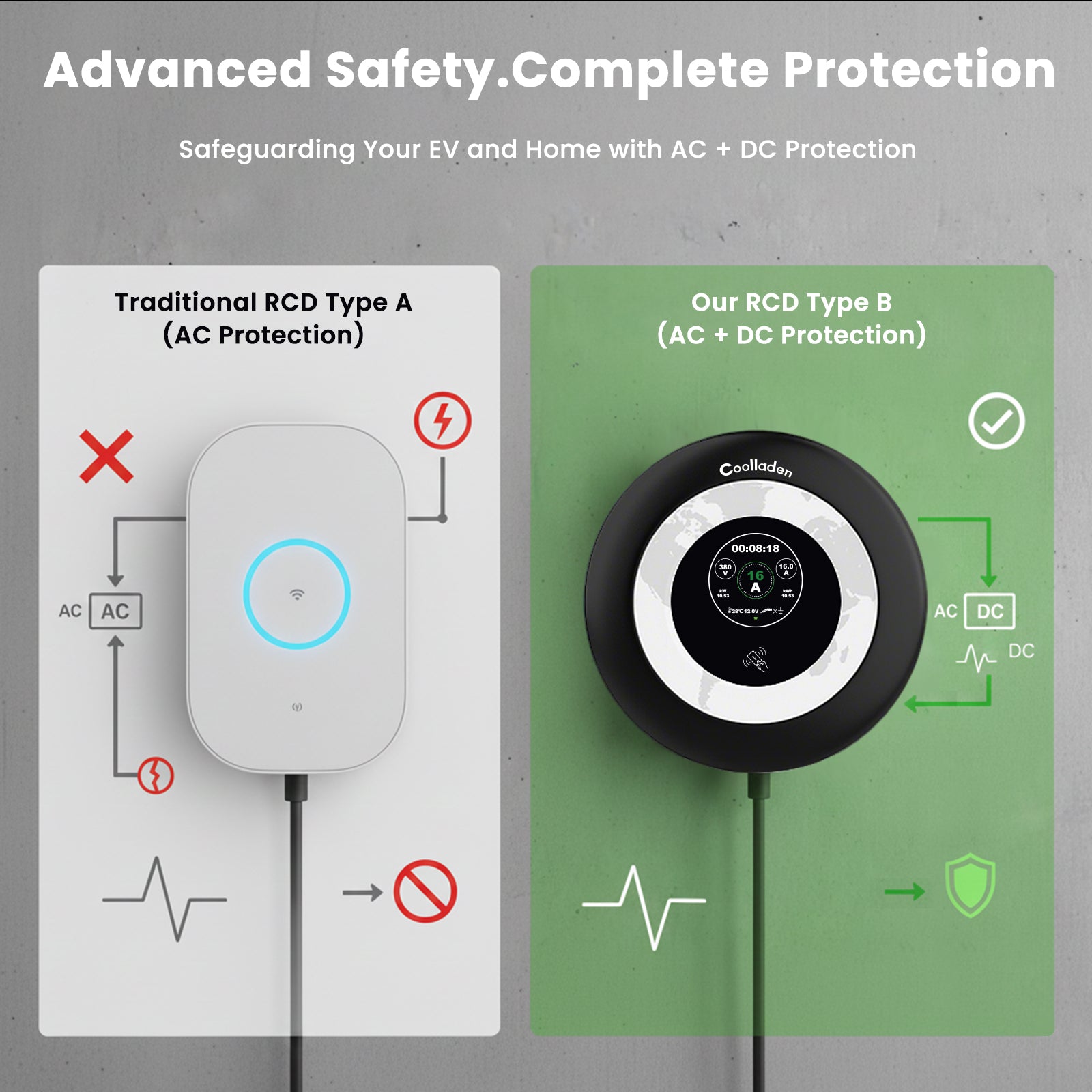 Sicherheit ist das Fundament von Coolladen. Unsere voll CE- und RoHS-zertifizierte Wallbox verfügt über einen integrierten RCD Typ B Sensor (AC 30mA + DC 6mA).